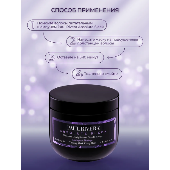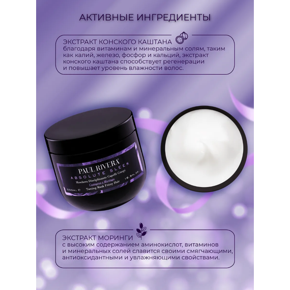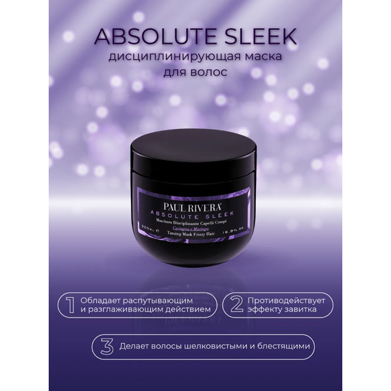 Разглаживающая маска Paul Rivera Absolute Sleek для волос с экстрактами каштана и моринги. Оказывает распутывающее и разглаживающее действие, устраняя курчавость. Волосы становятся шелковистыми и блестящими.