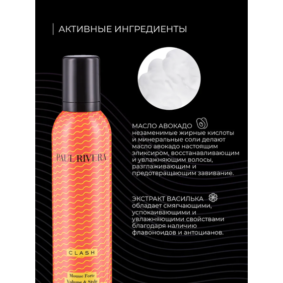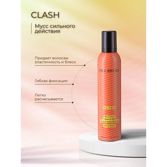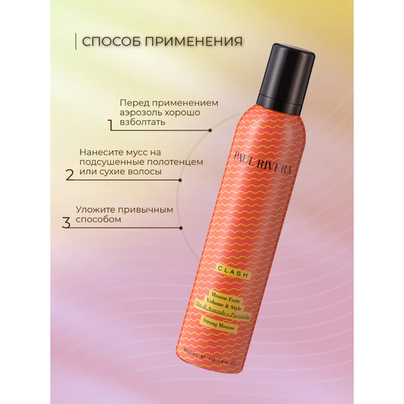 Paul Rivera Clash мусс защищает волосы от корней до кончиков, придавая им объем и эластичность. Профессиональный мусс для моделирования с надежной фиксацией, специально разработанную для максимального творчества. Его легкая кремовая текстура защищает волосы, делая их мягкими и шелковистыми. Обогащенный маслом авокадо и экстрактом василька, этот мусс придает волосам невероятный мокрый эффект. Он быстро сохнет, не оставляет следов и легко вычесывается щеткой, позволяя создавать новые образы в течении всего дня.