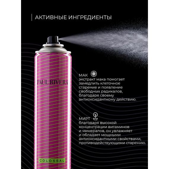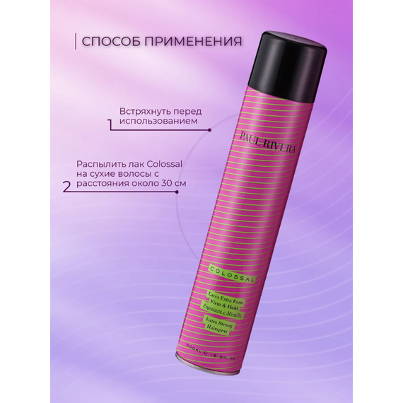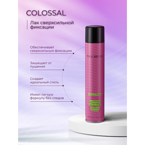 Paul Rivera Colossal сверхсильный лак для волос обеспечивает надежную фиксацию волос, не перегружая локоны. Он защищает от влаги с эффектом против пушения, обеспечивая профессиональную укладку. Формула, обогащенная экстрактами мака и черники. Имеет едва заметную текстуру, которая не утяжеляет локоны. Прозрачная вуаль продукта ласкает волосы, придавая им форму, обеспечивая длительную и эффективную фиксацию. Лак легко смывается и не оставляет следов.