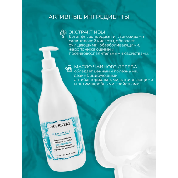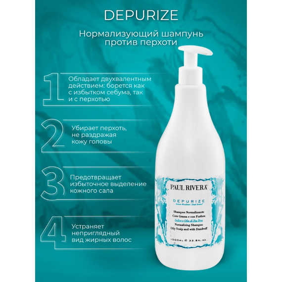 Бивалентный нормализующий шампунь Paul Rivera Depurize против перхоти для жирной кожи головы. Состав с содержанием экстракта ивы и масла чайного дерева деликатно промывает и очищает кожу головы, уменьшая секрецию сальных желёз и образование перхоти.