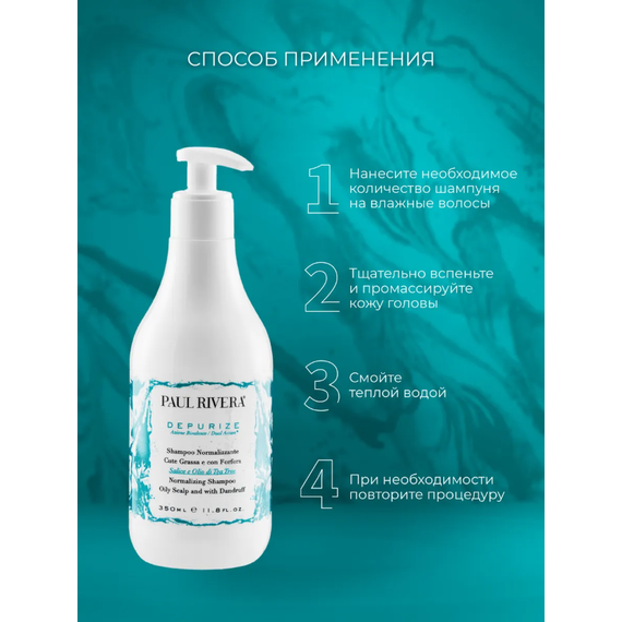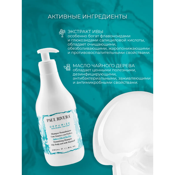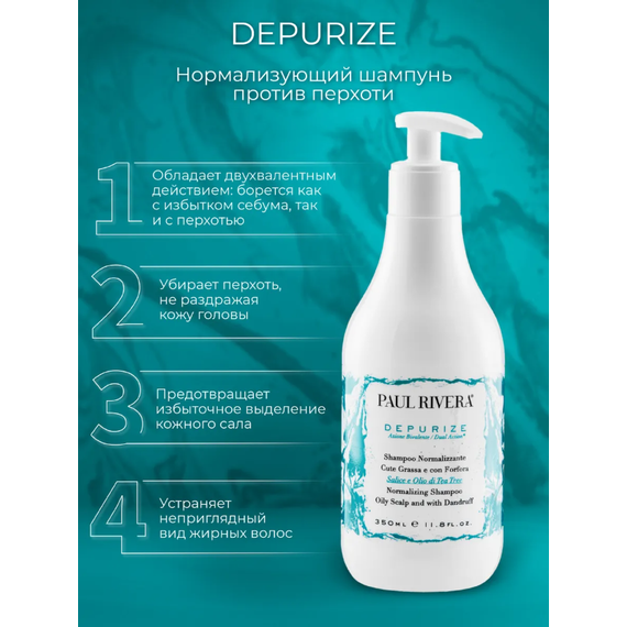 Paul Rivera Depurize шампунь - очищает и защищает от перхоти и кожного сала. При регулярном использовании шампунь проявляет двухвалентное действие: он мягко устраняет перхоть и очищает кожу головы от избытка кожного жира, создавая здоровую и гигиеничную среду. Помогает восстановить естественный pH-баланс, оказывая интенсивное, но мягкое лечебное воздействие на кожу головы. Шампунь Depurize обогащен экстрактом ивы и маслом чайного дерева - активными ингредиентами, которые борются с причинами, вызывающими жирность кожи головы и перхоть. Его эффективность и переносимость прошли клинические испытания.