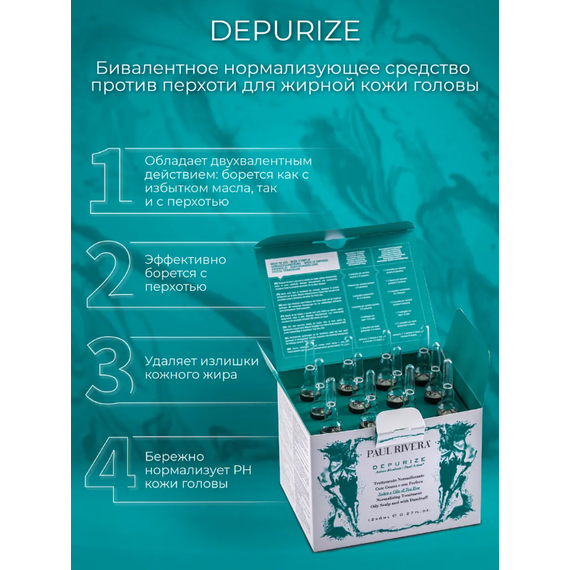 Paul Rivera Depurize - эффективное профессиональное средство для борьбы с перхотью и избытком кожного жира. Благодаря очищающему действию экстракта ивы и масла чайного дерева в его формуле, двухвалентный лосьон нормализует жирность кожи головы, склонную к перхоти. Легкая, плотная и без перхоти кожа головы и волосы выглядят заметно чище и здоровее. Его эффективность и переносимость прошли клинические испытания. Для достижения оптимальных результатов используйте лечебные ампулы вместе с шампунем Depurize.