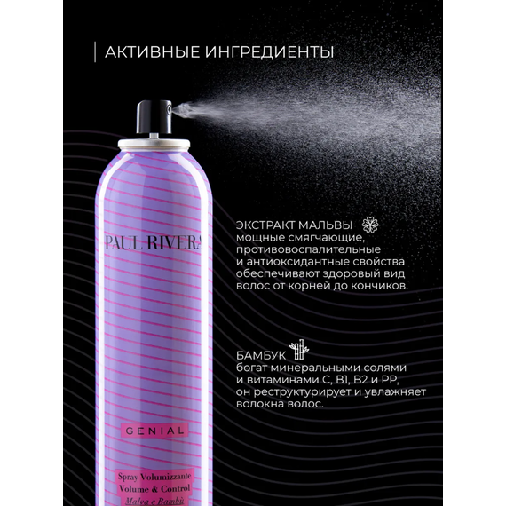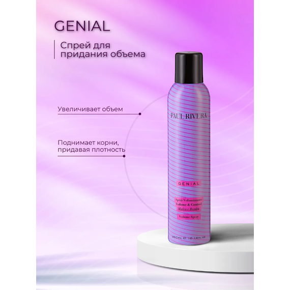 Добейтесь максимального объема с Paul Rivera Genial: спреем для увеличения объема. Этот продукт придает объем, благодаря своей инновационной технологии, которая воздействует на корни, пролонгируя лифтинговое действие. Спрей создает защитную пленку, которая придает блеск, не перегружая локоны. Блестящие и полные объема волосы выглядят пышными и чувственными. Спрей обогащен экстрактами мальвы и бамбука, идеально подходит для тонких и текстурированных волос, благодаря чему волосы выглядят более здоровыми от корней до кончиков.