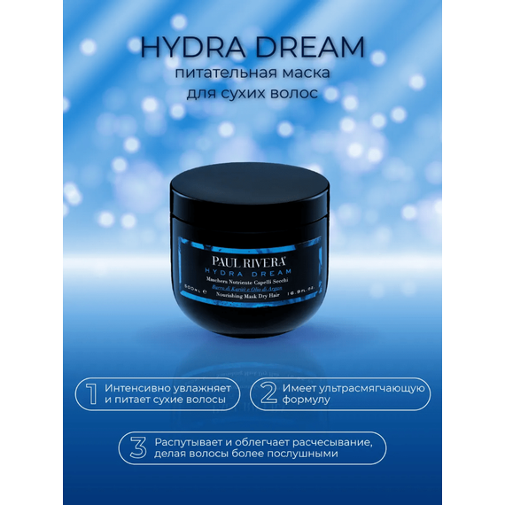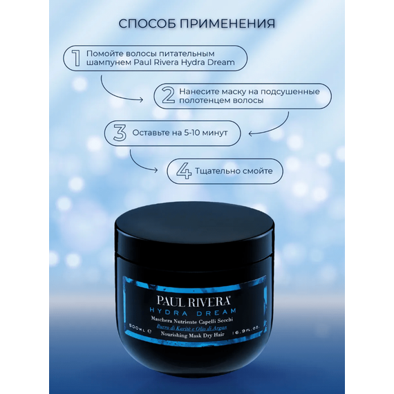 После очищения с питательным шампунем Paul Rivera Hydra Dream нанесите маску на подсушенные полотенцем волосы и оставьте на 5-10 минут. Тщательно смойте.