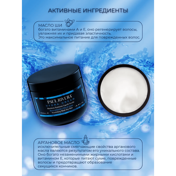 Питательная маска Paul Rivera Hydra Dream для сухих волос с маслом карите и аргановым маслом. Формула с сильным смягчающим и распутывающим действием предотвращает пушение и придаёт волосам эластичность и блеск. Регулярное использование этой маски для сухих волос улучшает текстуру локонов, делая их шелковисто-мягкими, легкими и блестящими.