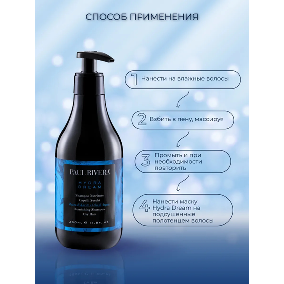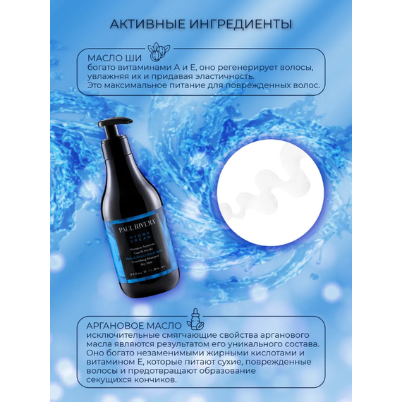 Шампунь для очень сухих, ломких волос: Paul Rivera Hydra Dream мягко очищает и обеспечивает интенсивное питание, не перегружая локоны. Благодаря своей формуле, обогащенной маслом ши и аргановым маслом, он помогает распутать волосы, делая их блестящими и шелковистыми. Кремообразная текстура шампуня обеспечивает нежное пенообразование, делая волосы мягкими и идеально кондиционируемыми.
