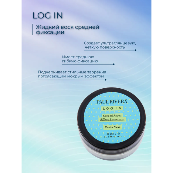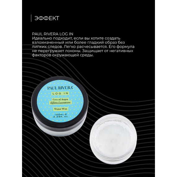 Воск Paul Rivera Log In для создания глянцевого «мокрого» образа. Обеспечивает легкую укладку: волосам можно придать желаемую форму с естественным блеском и гибкой фиксацией. Идеально подходит, если вы хотите создать взлохмаченный или более гладкий образ без липких следов. Легко расчесывается. Его формула не перегружает локоны. Защищает от негативных факторов окружающей среды.