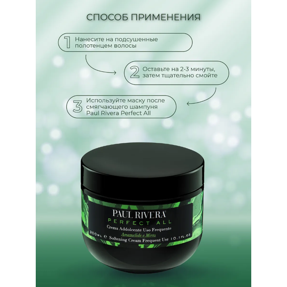 Благодаря своим смягчающим свойствам крем-кондиционер Paul Rivera Perfect All нежно обволакивает волосы и подходит для частого использования. Легкая, быстродействующая формула не утяжеляет волосы, делает их мягкими и послушными: экстракты гамамелиса и мирта действуют совместно, гарантируя оптимальное увлажнение, питание и видимый кондиционирующий эффект.