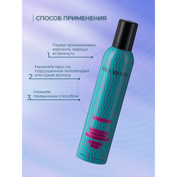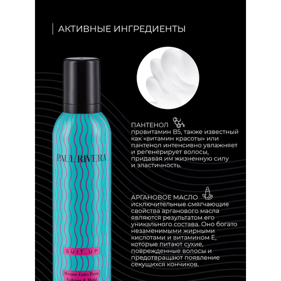 Ультрамягкая текстура Paul Rivera Suit Up позволяет создавать впечатляющие объемы и создавать четкие локоны. Мусс Paul Rivera - это особо прочный мусс с нелипкой формулой, который придает структуру локонам и поддерживает укладку, не высушивая волосы. Обеспечивает очень сильную фиксацию и стойкость в течение всего дня. Благодаря формуле, обогащенной маслом арганы и пантенолом, волосы дольше защищены, увлажняются и становятся более блестящими.