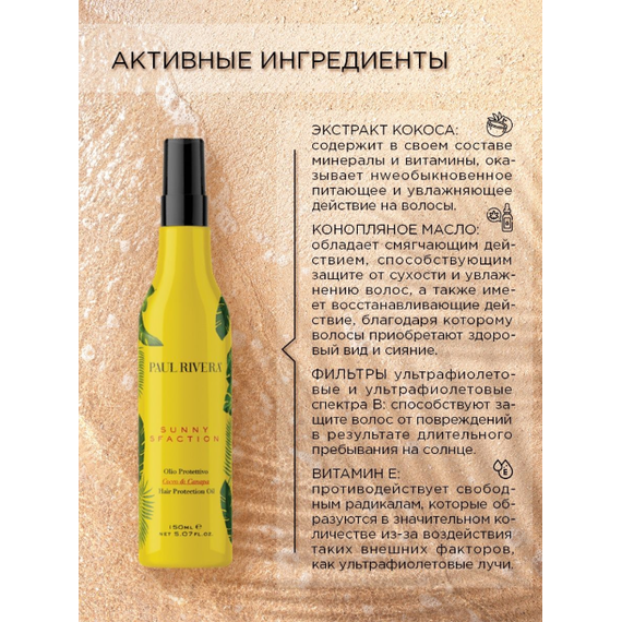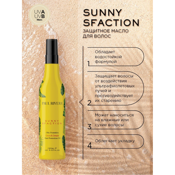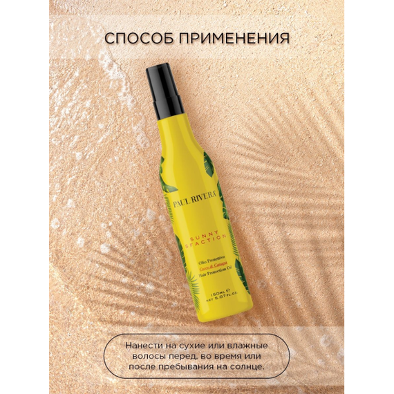 Защитное масло для волос Paul Rivera Sunny Sfaction обладает специальной водостойкой формулой, содержащей в своем составе ультрафиолетовые фильтры и витамин Е для защиты от повреждений в результате длительного пребывания на солнце, воздействия хлора и морской воды. Оно наносится на влажные или сухие волосы и благодаря своему восстанавливающему действию придает им здоровый вид, не перегружая.