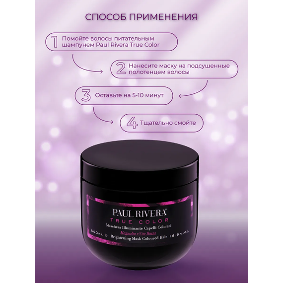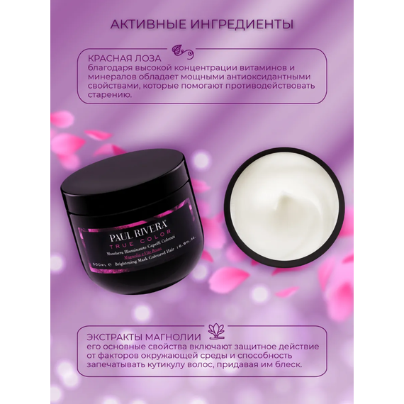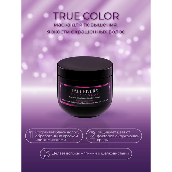 Маска Paul Rivera True Color для повышения яркости окрашенных волос с экстрактами магнолии и листьев красного винограда. Хорошо увлажняет и восстанавливает волосы, сохраняя цвет и делая их сияющими.
