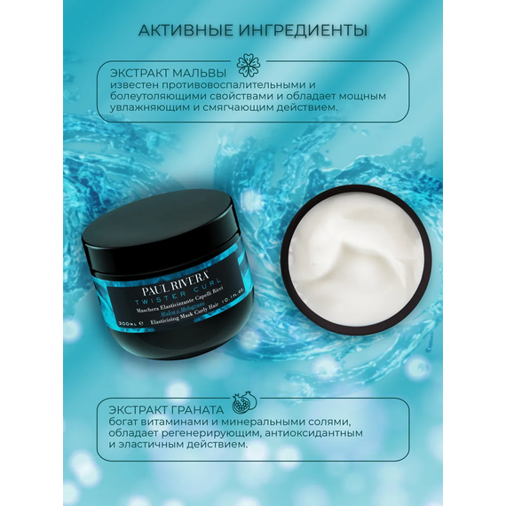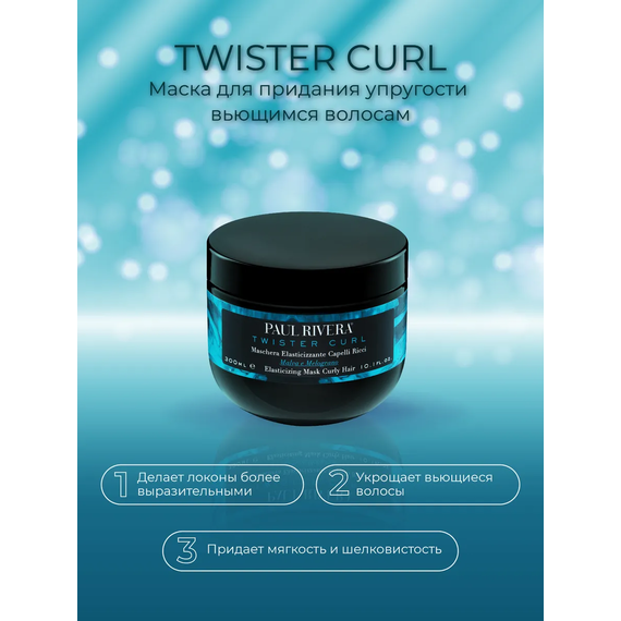 Paul Rivera Twister Curl - это маска с роскошной текстурой, обогащенная экстрактами мальвы и граната, специально разработанная для того, что бы сделать локоны более выразительными. Увлажняет и питает вьющиеся или волнистые волосы, обеспечивая оптимальную упругость, способствует распутыванию и облегчению расчёсывания даже самых сухих волос. Естественно красивые, вьющиеся локоны становятся послушными и шелковисто-гладкими. Волосы мягкие на ощупь, очень легкие и не вьются.