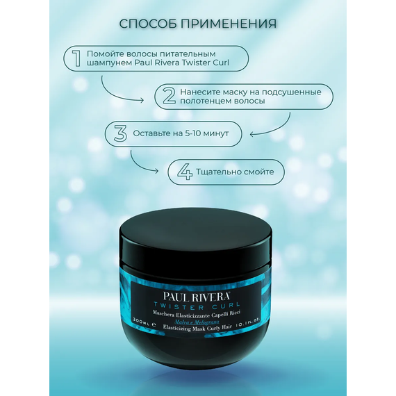 После очищения шампунем Twister Curl нанесите маску на подсушенные полотенцем волосы и оставьте на 5-10 минут. Тщательно смойте.