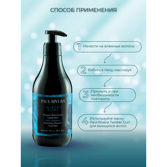 Нанесите шампунь на влажные волосы и взбейте в пену, массируя. Промойте и при необходимости повторите процедуру. Затем используйте маску Paul Rivera Twister Curl для вьющихся волос.