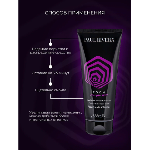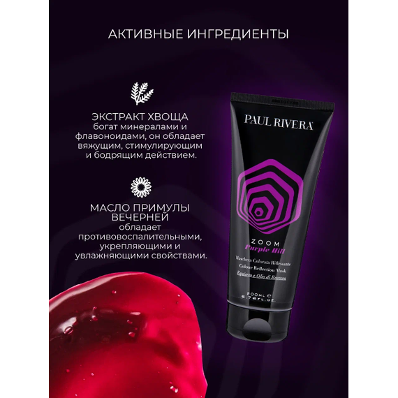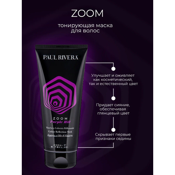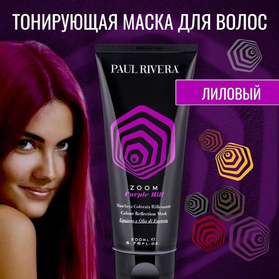 Paul Rivera ZOOM Purple Hill - маска для волос позволяет создавать сияющие блики, мгновенно оживляя и придавая сияние. Благодаря 8 оттенкам, доступным в линии, Zoom дарит вам свободу исследовать новые цветовые горизонты! Маска легко наносится и имеет сверхбыстрое время воздействия (3-5 минут). Восстанавливает волосы во время процедуры: формула обогащена экстрактом хвоща, который стимулирует и укрепляет кожу головы, и маслом примулы вечерней, обладающей исключительными косметическими свойствами.