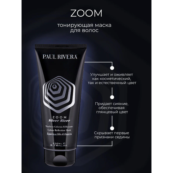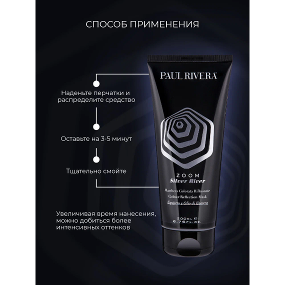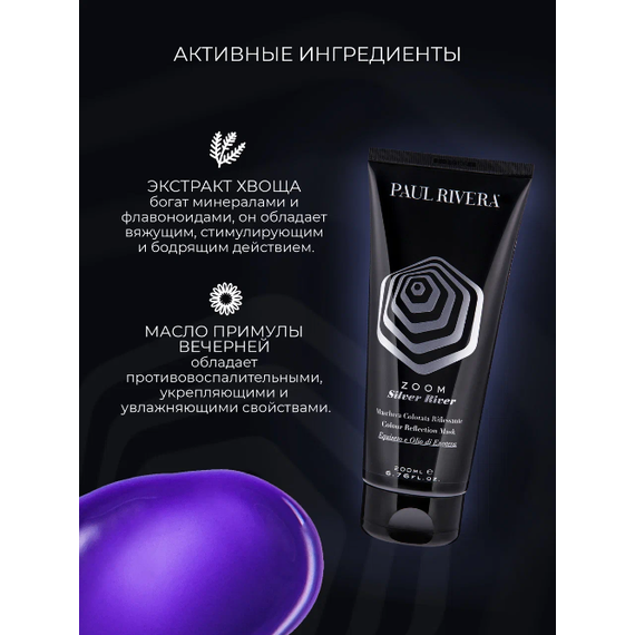 Paul Rivera ZOOM Silver River - маска для волос позволяет создавать сияющие блики, мгновенно оживляя и придавая сияние. Благодаря 8 оттенкам, доступным в линии, Zoom дарит вам свободу исследовать новые цветовые горизонты! Маска легко наносится и имеет сверхбыстрое время воздействия (3-5 минут). Восстанавливает волосы во время процедуры: формула обогащена экстрактом хвоща, который стимулирует и укрепляет кожу головы, и маслом примулы вечерней, обладающей исключительными косметическими свойствами.