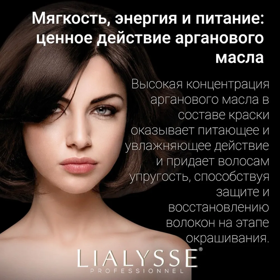 Lialysse – это уникальная крем-краска для волос с аргановым маслом и кератином. Результат исследований Comprof, в котором кремообразная текстура сочетается с лечебным действием, обеспечивая яркий и невероятно насыщенный цвет, благодаря высокой концентрации микропигментов, глубоко проникающих в волокна волос. С помощью Lialysse выполняется равномерное яркое окрашивание по всей длине волос, которое способствует сохранению красоты и здоровья волос благодаря составу с содержанием арганового масла и кератина. Активные ингредиенты специально предназначены для питания, увлажнения и сохранения упругости волос при выполнении процедуры окрашивания в домашних условиях. Кроме того, во время выполнения химических процедур, в том числе в домашних условиях, совместное действие кератина и арганового масла обеспечивает питание и увлажнение, необходимые для защиты и сияния волос. Уход и окрашивание в одном продукте.