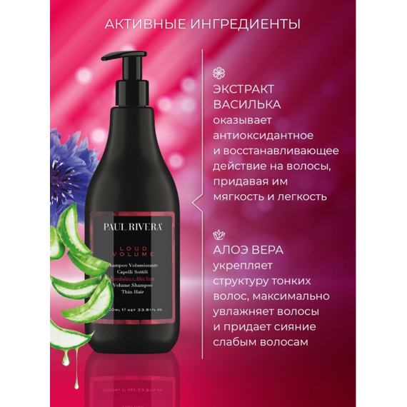 Шампунь для объема волос Loud Volume бережно очищает волосы, возвращая им жизненную энергию. Благодаря содержанию экстракту василька и алоэ вера шампунь не утяжеляет локоны и придает тонким волосам более густой и пышный вид.