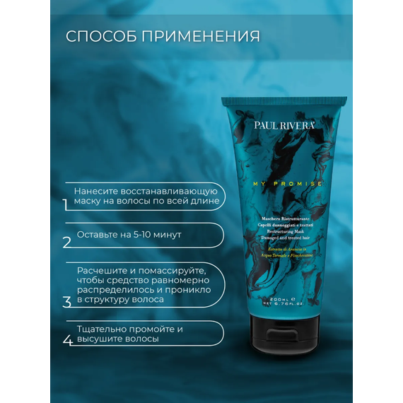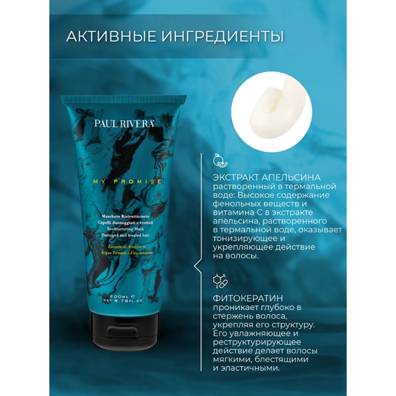 Маска Paul Rivera My Promise, разработанная для лечения и восстановления волосяного волокна поврежденных волос, изнутри, защищая их от теплового воздействия горячих инструментов и факторов окружающей среды. Экстракт апельсина в термальной воде и фитокератин из конопли и риса создают на волосах защитную пленку с разглаживающим эффектом, делая волосы более мягкими и сияющими.