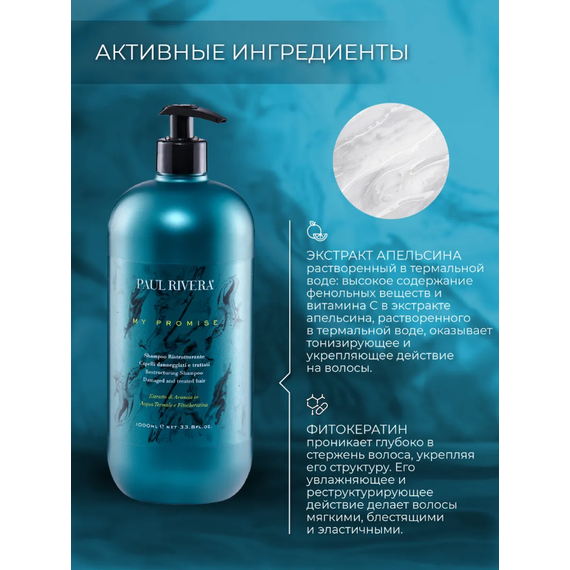 Шампунь Paul Rivera My Promise помогает регенерировать и увлажнять поврежденные и ломкие волосы, подготавливая их к интенсивному восстановительному лечению. Содержит экстракт апельсина в термальной воде и фитокератин, он защищает волосы от теплового воздействия горячих инструментов и загрязняющих веществ окружающей среды. Шампунь воздействует на волокна волос, делая их сильнее, более здоровыми и сияющими.
