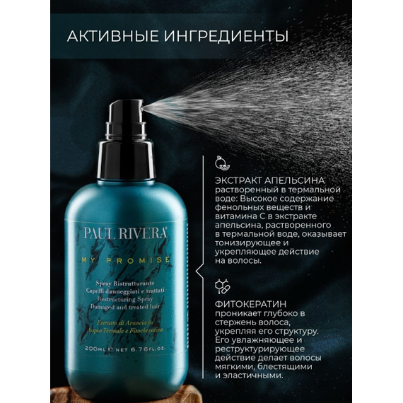 Спрей Paul Rivera продлевает и усиливает эффект от процедуры по восстановлению волос My Promise. Активные ингредиенты формулы: экстракт апельсина в термальной воде и фитокератин, придают плотность и объем даже самым тонким волосам, ослабленным химическими средствами или воздействием окружающей среды. Защищает от воздействиягорячих инструментов (выпрямителей и фенов), запечатывает секущиеся кончики, поддерживает укладку.